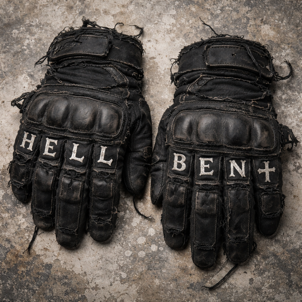 Motorcycle gloves with "HELLBENT"across the fingers one letter on each finger but the T is an upside down cross