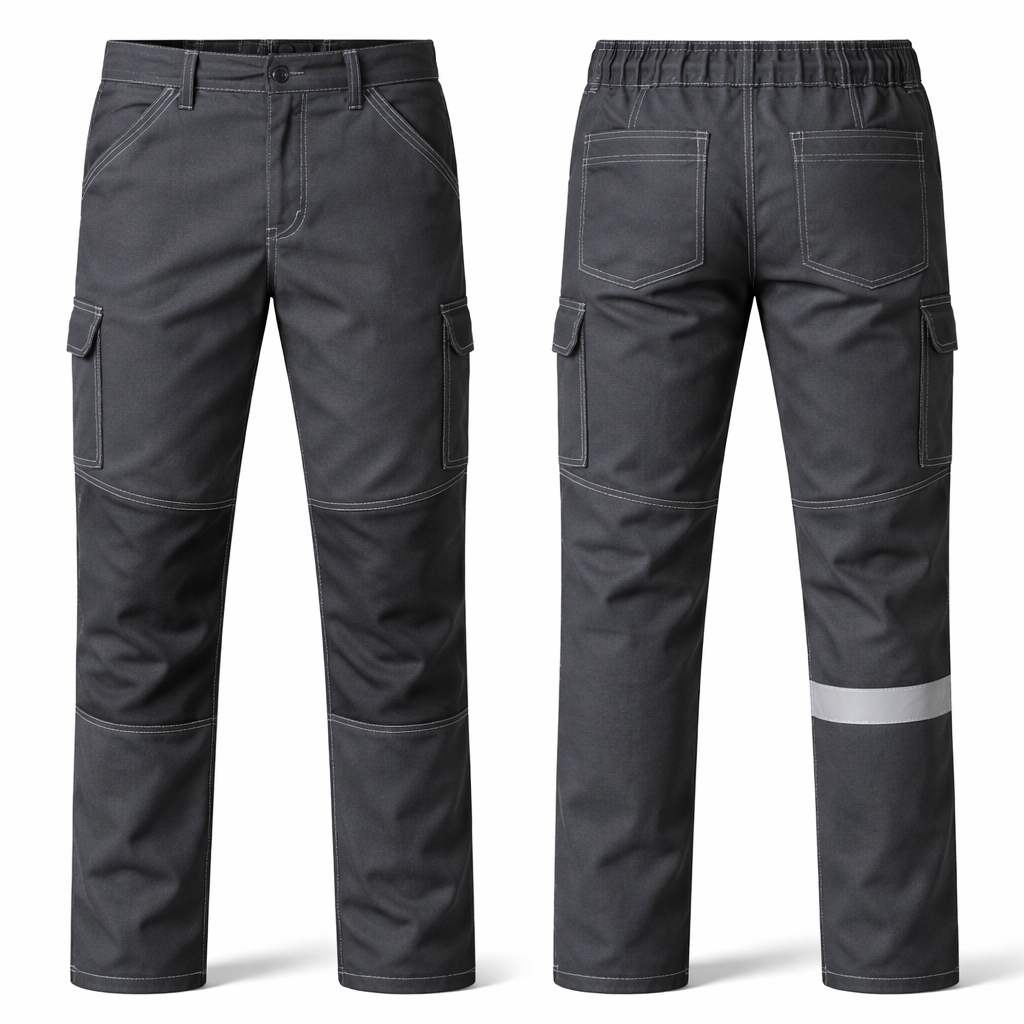 Straight-cut workwear trousers in dark grey fabric with a slight sheen. Classic fly with buttons. Elastic back waistband. Slanted patch pockets, knee pads, and back patch pockets. Reflective stripe on right leg. Contrast stitching. Front and back views.