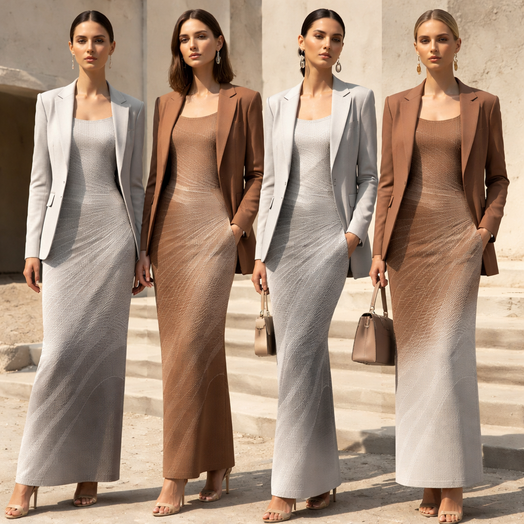 Ready To Wear fashion design: **Ready-to-Wear Prompt:** Slim-fit long dresses and tailored jackets in cotton knit, featuring a straight silhouette. Colors are a mix of light grey and warm brown. The pattern includes thick, wavy lines that gradually fade out, resembling dissolving textures.