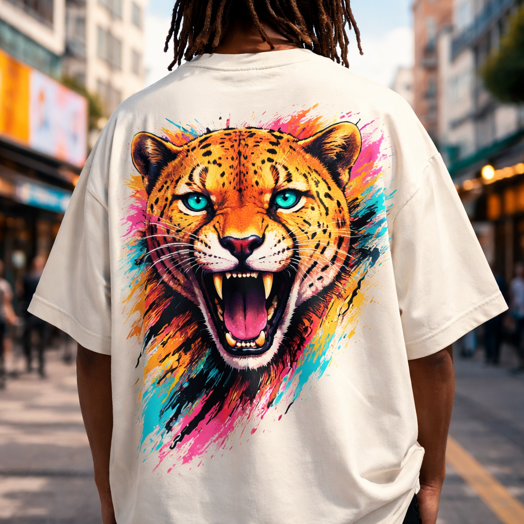 Streetwear fashion design: Oversized cotton t-shirt with a large cheetah face graphic on the back. Bold, eye-catching colors. Relaxed fit.