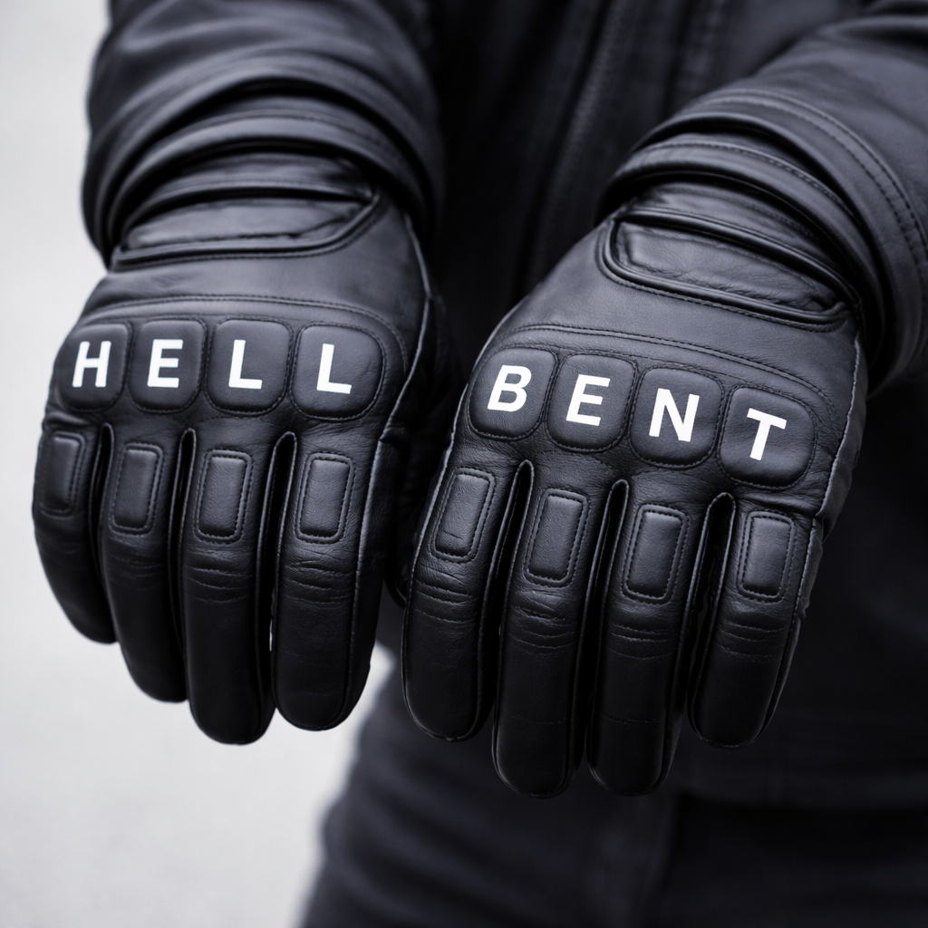Scandinavian fashion design: Sleek black leather motorcycle gloves with "HELLBENT" spelled across the fingers in white sans-serif font, where the 'T' is an inverted cross. Minimalist design, clean lines.