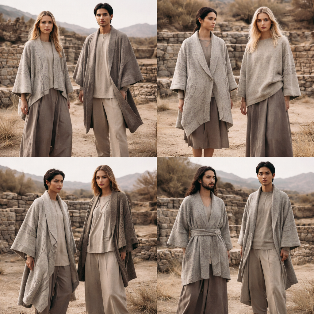Scandinavian fashion design: Collection inspired by Quilmes ruins. Silhouettes are relaxed and clean. Fabrics are natural cotton and wool, in grey and earthy tones, with subtle patterns inspired by winding paths. Fit is comfortable and unfussy.