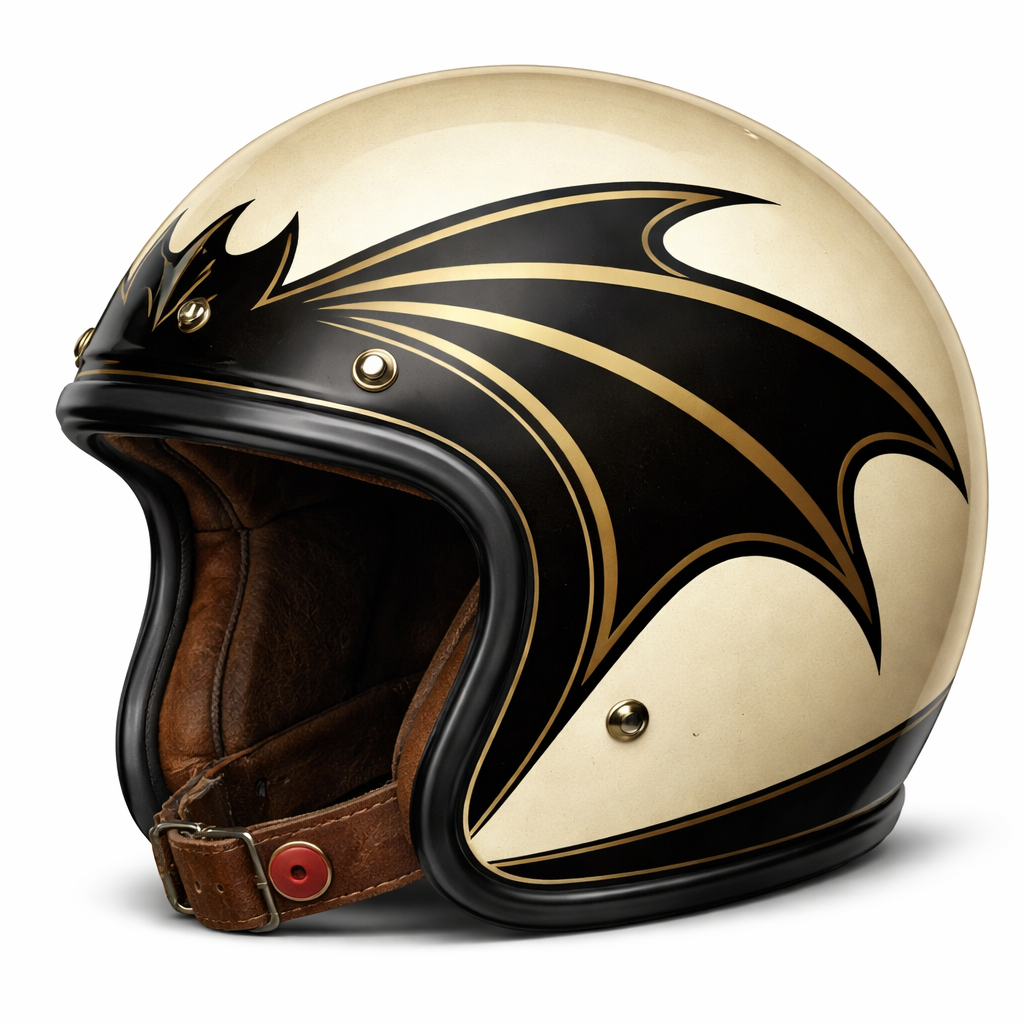 Vintage fashion design: Vintage motorcycle helmet with a sleek, art deco silhouette. Bold bat-wing graphics adorn the sides in black and gold.