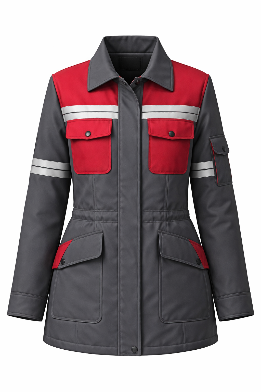 Женская куртка из серой плащёвки, рабочий вариант, прямого слегка приталенного силуэта, длиной до середины бедра. Материал – матовая водо‑ и ветронепроницаемая плащевая с блеском ткань средней плотности, без блеска, основного тёмно‑серого цвета. Куртка застёгивается по центру переда на потайную планку с чёрными кнопками или молнией, планка визуально разделена вертикальными строчками. Верхняя часть переда и спинки выполнена из контрастной красной плащёвки широкой кокеткой по всей ширине плеч. По низу кокетки спереди и сзади проходит горизонтальная широкая светло‑серая или белая вставка с двумя параллельными декоративными строчками, создающая эффект сигнальной полосы. На спинке под кокеткой – горизонтальная притачная деталь (пояс‑обтачка) в цвет основного серого. Воротник отложной, рубашечного типа, средней высоты, в цвет основного серого, с чёткой формой и аккуратной отстрочкой по краю. На груди спереди расположены два объёмных накладных кармана из красной ткани, прямоугольной формы, с клапанами на кнопках; верхняя линия карманов совпадает с нижним краем светлой горизонтальной вставки. В нижней части полочек, по бокам, находятся большие накладные карманы из серой плащёвки, с верхней скошенной частью и небольшими диагональными красными вставками по верхнему наружному углу. Рукава длинные, втачные, серого цвета по всей длине. В верхней трети рукава, чуть выше локтя, проходит горизонтальная светло‑серая/белая полоса с двумя параллельными строчками, аналогичная полосе на груди и спине. На нижней трети одного из рукавов (обычно левого) дополнительно расположен накладной продолговатый карман с клапаном. Низ рукавов оформлен простыми притачными манжетами без сложных застёжек, с отстрочкой по контуру. Низ куртки прямой, слегка закруглённый по бокам, с одинарной отстрочкой по краю, без разрезов. Все швы и линии контрастно отстрочены прямой чёрной или тёмно‑серой строчкой, подчёркивая конструктивные детали и придавая куртке аккуратный технический вид. Общий образ – современная женская рабочая куртка в индустриальном стиле, с серой основой, яркими красными зонами и светлыми сигнальными полосами., None style