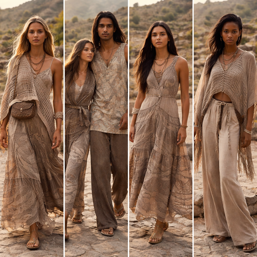 Sustainable fashion design: **Sustainable fashion prompt:** Design a collection inspired by the ruins of Quilmes, Tucuman. Use winding street patterns as prints and crochet textures. Earthy greys and browns. Focus on natural, recycled cotton and linen. Silhouettes are comfortable and adaptable, with a relaxed fit.