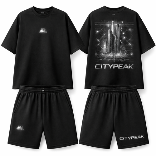 Create a realistic modern streetwear fashion mockup of a matching summer set composed of an oversized t-shirt and matchi...