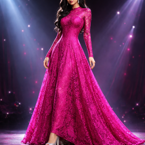 Full body woman with black hair, A-line silhouette, floor-length fuchsia lace dress with long sleeves, elegant, very high platform wedge shoes, stage lighting, realistic.