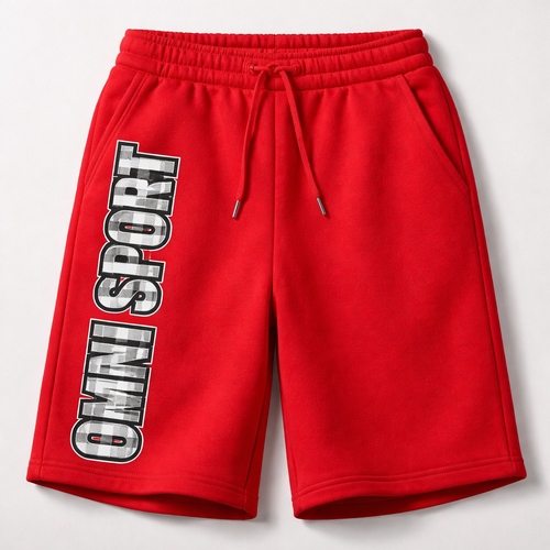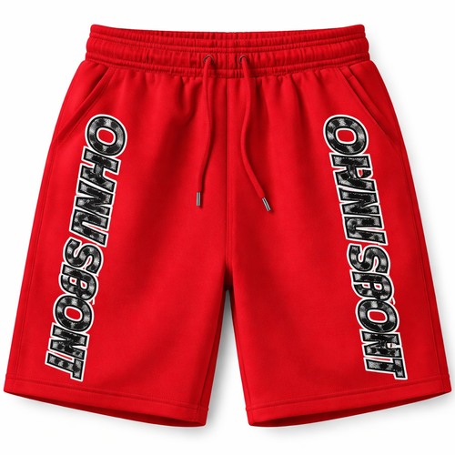The name of my brand is “Omni Sport” , create a pair Of sweat shorts that are red with the words Omni sport going up the...