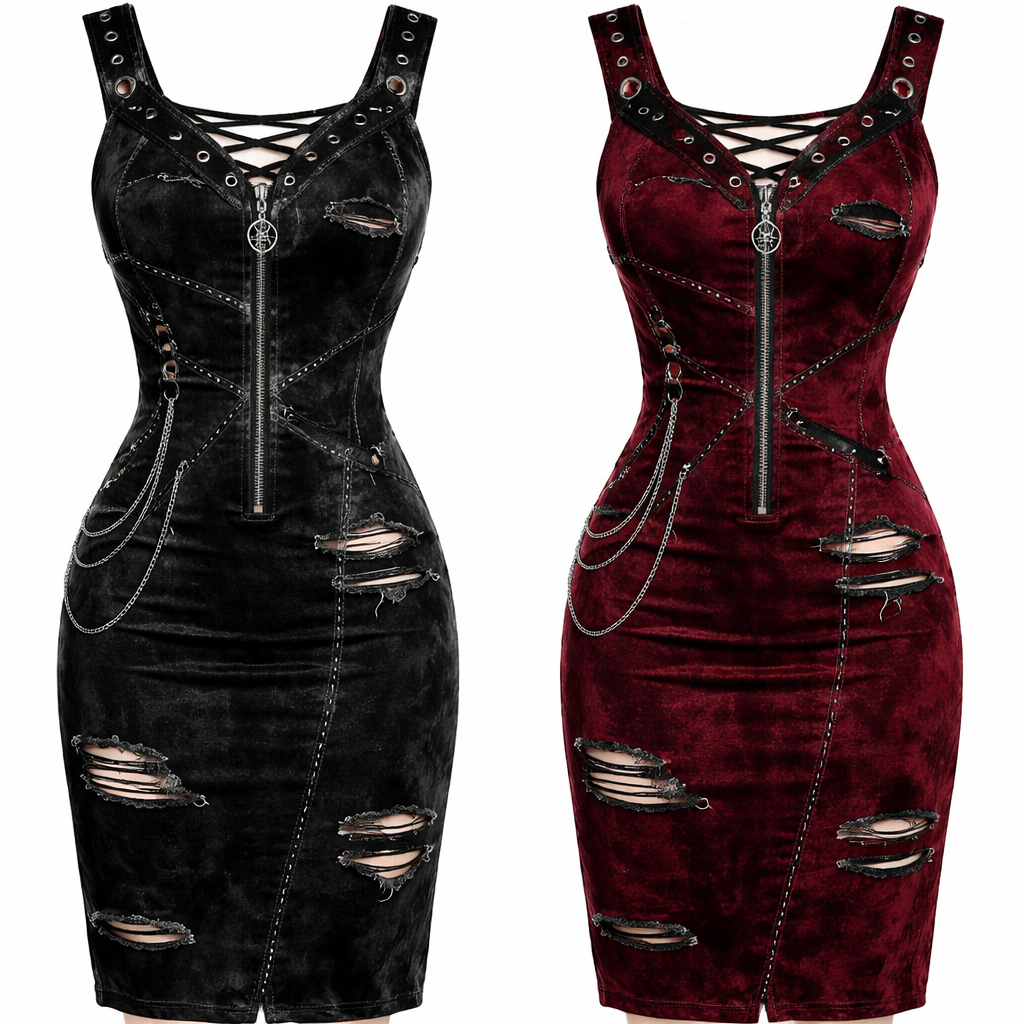 Punk fashion design: Knee-length velvet dress, slim fit. Ripped details and exposed stitching. Black or deep red.