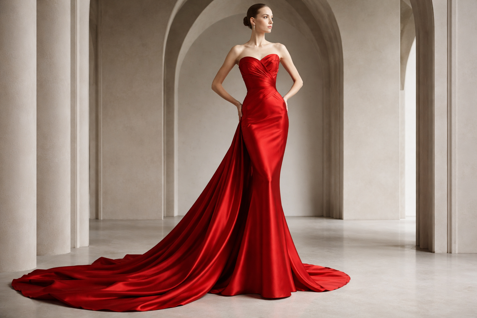 Haute Couture fashion design: An architectural gown, red silk, column silhouette, precise tailoring, dramatic train.