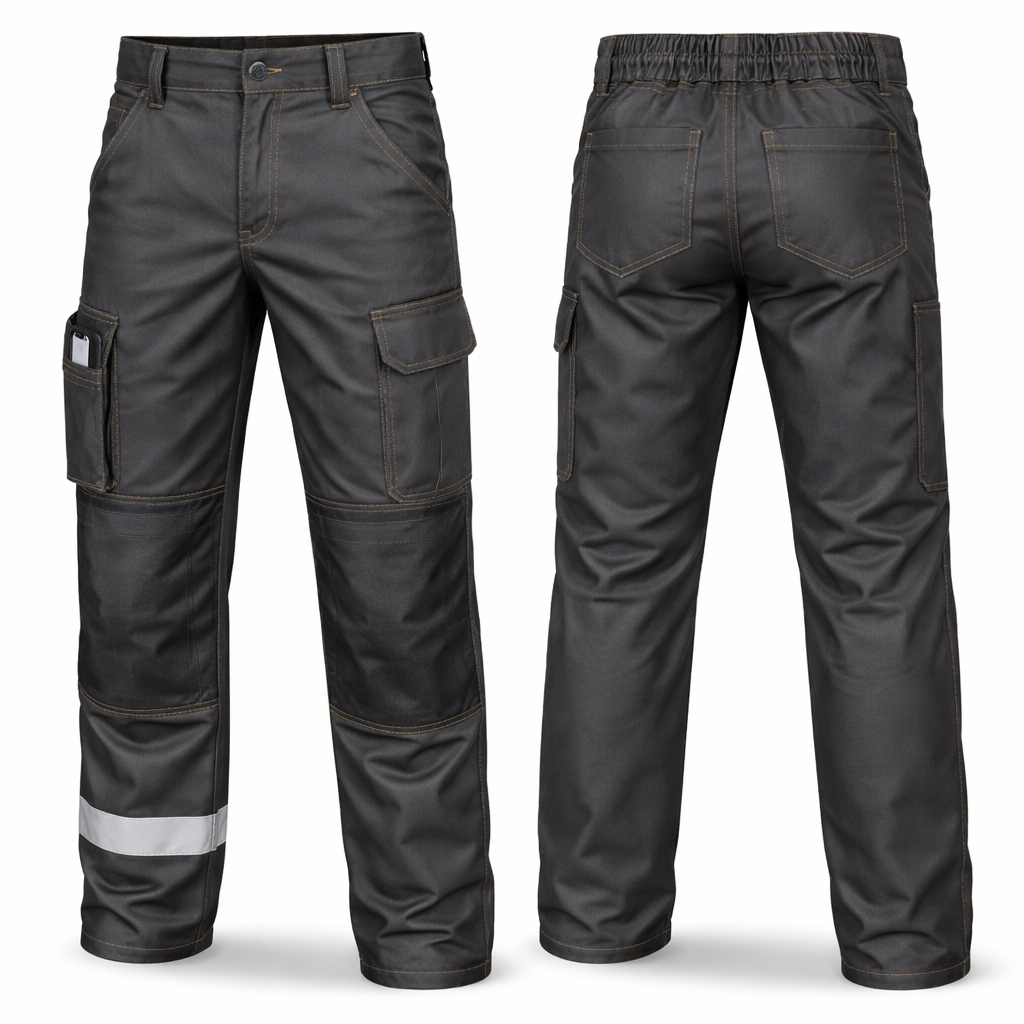 Прямые брюки из стиля рабочей одежды. Пояс широкий со шлёвками для ремня. По спинке от левого бокового шва до правого бокового шва проложена эластичная резинка. Резинка делает на поясе красивую сборку. На передних половинках под поясом накладные карманы. вход в эти карманы с наклоном, по типу карманов ХУЛИГАН. В районе коленей накладные наколенники с входом для засовывания туда смягчающего материала. На правой калошине, ниже наколенника, пришита круговая светоотражающая полоска. На левой половинке светоотражающей полоски нет. На ягодицах накладные карманы по типу джинсовых, но без верхних клапанов. Гульфик классический на пуговицах и пуговица на поясе. С левого бока по боковому шву - накладной карман для телефона. С правого бока по боковому шву нет накладного кармана. Для шитья использовать тёмно серую плащёвку с лёгким блеском. нужно показать вид спереди и сзади. На задних половинках над коленным сгибом не должно быть поперечных швов. Для отделочных строчек нужно использовать контрастные нитки., None style