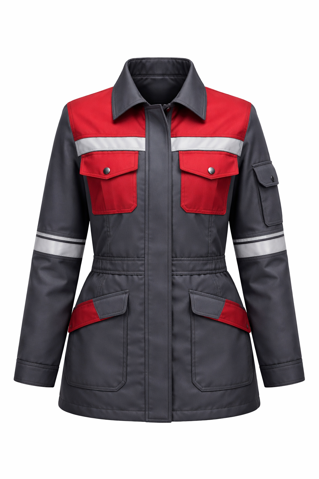 Женская куртка из серой плащёвки, рабочий вариант, прямого слегка приталенного силуэта, длиной до середины бедра. Материал – матовая водо‑ и ветронепроницаемая плащевая с блеском ткань средней плотности, с блеском, основного тёмно‑серого цвета. Куртка застёгивается по центру переда на потайную планку с пуговицами, планка визуально разделена вертикальными строчками. Верхняя часть переда и спинки выполнена из контрастной красной плащёвки широкой кокеткой по всей ширине плеч. По низу кокетки спереди и сзади проходит горизонтальная широкая светло‑серая или белая вставка с двумя параллельными декоративными строчками, создающая эффект сигнальной полосы. На спинке под кокеткой – горизонтальная притачная деталь (пояс‑обтачка) в цвет основного серого. Воротник отложной, рубашечного типа, средней высоты, в цвет основного серого, с чёткой формой и аккуратной отстрочкой по краю. На груди спереди расположены два объёмных накладных кармана из красной ткани, прямоугольной формы, с клапанами на кнопках; верхняя линия карманов совпадает с нижним краем светлой горизонтальной вставки. В нижней части полочек, по бокам, находятся большие накладные карманы из серой плащёвки, с верхней скошенной частью и небольшими диагональными красными вставками по верхнему наружному углу. Рукава длинные, втачные, серого цвета по всей длине. В верхней трети рукава, чуть выше локтя, проходит горизонтальная светло‑серая/белая полоса с двумя параллельными строчками, аналогичная полосе на груди и спине. На нижней трети одного из рукавов (обычно левого) дополнительно расположен накладной продолговатый карман с клапаном. Низ рукавов оформлен простыми притачными манжетами без сложных застёжек, с отстрочкой по контуру. Низ куртки прямой, слегка закруглённый по бокам, с одинарной отстрочкой по краю, без разрезов. Все швы и линии контрастно отстрочены прямой чёрной или тёмно‑серой строчкой, подчёркивая конструктивные детали и придавая куртке аккуратный технический вид. Общий образ – современная женская рабочая куртка в индустриальном стиле, с серой основой, яркими красными зонами и светлыми сигнальными полосами.