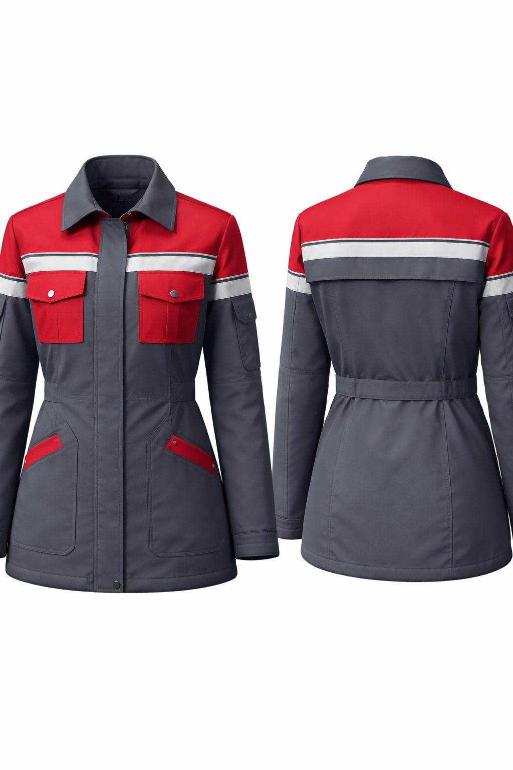 Женская куртка из серой плащёвки, рабочий вариант, прямого слегка приталенного силуэта, длиной до середины бедра. Материал – матовая водо‑ и ветронепроницаемая плащевая с блеском ткань средней плотности, с блеском, основного тёмно‑серого цвета. Куртка застёгивается по центру переда на потайную планку с пуговицами, планка визуально разделена вертикальными строчками. На спинке отлетная кокетка. Покажи вид спереди и сзади. Светоотражающая полоска на левом рукаве не нужна Верхняя часть переда и спинки выполнена из контрастной красной плащёвки широкой кокеткой по всей ширине плеч. По низу кокетки спереди и сзади проходит горизонтальная широкая светло‑серая или белая вставка с двумя параллельными декоративными строчками, создающая эффект сигнальной полосы. На спинке под кокеткой – горизонтальная притачная деталь (пояс‑обтачка) в цвет основного серого. Воротник отложной, рубашечного типа, средней высоты, в цвет основного серого, с чёткой формой и аккуратной отстрочкой по краю. На груди спереди расположены два объёмных накладных кармана из красной ткани, прямоугольной формы, с клапанами на кнопках; верхняя линия карманов совпадает с нижним краем светлой горизонтальной вставки. В нижней части полочек, по бокам, находятся большие накладные карманы из серой плащёвки, с верхней скошенной частью и небольшими диагональными красными вставками по верхнему наружному углу. Рукава длинные, втачные, серого цвета по всей длине. В верхней трети рукава, чуть выше локтя, проходит горизонтальная светло‑серая/белая полоса с двумя параллельными строчками, аналогичная полосе на груди и спине. На нижней трети одного из рукавов (обычно левого) дополнительно расположен накладной продолговатый карман с клапаном. Низ рукавов оформлен простыми притачными манжетами без сложных застёжек, с отстрочкой по контуру. Низ куртки прямой, слегка закруглённый по бокам, с одинарной отстрочкой по краю, без разрезов. Все швы и линии контрастно отстрочены прямой чёрной или тёмно‑серой строчкой, подчёркивая конструктивные детали и придавая куртке аккуратный технический вид. Общий образ – современная женская рабочая куртка в индустриальном стиле, с серой основой, яркими красными зонами и светлыми сигнальными полосами.