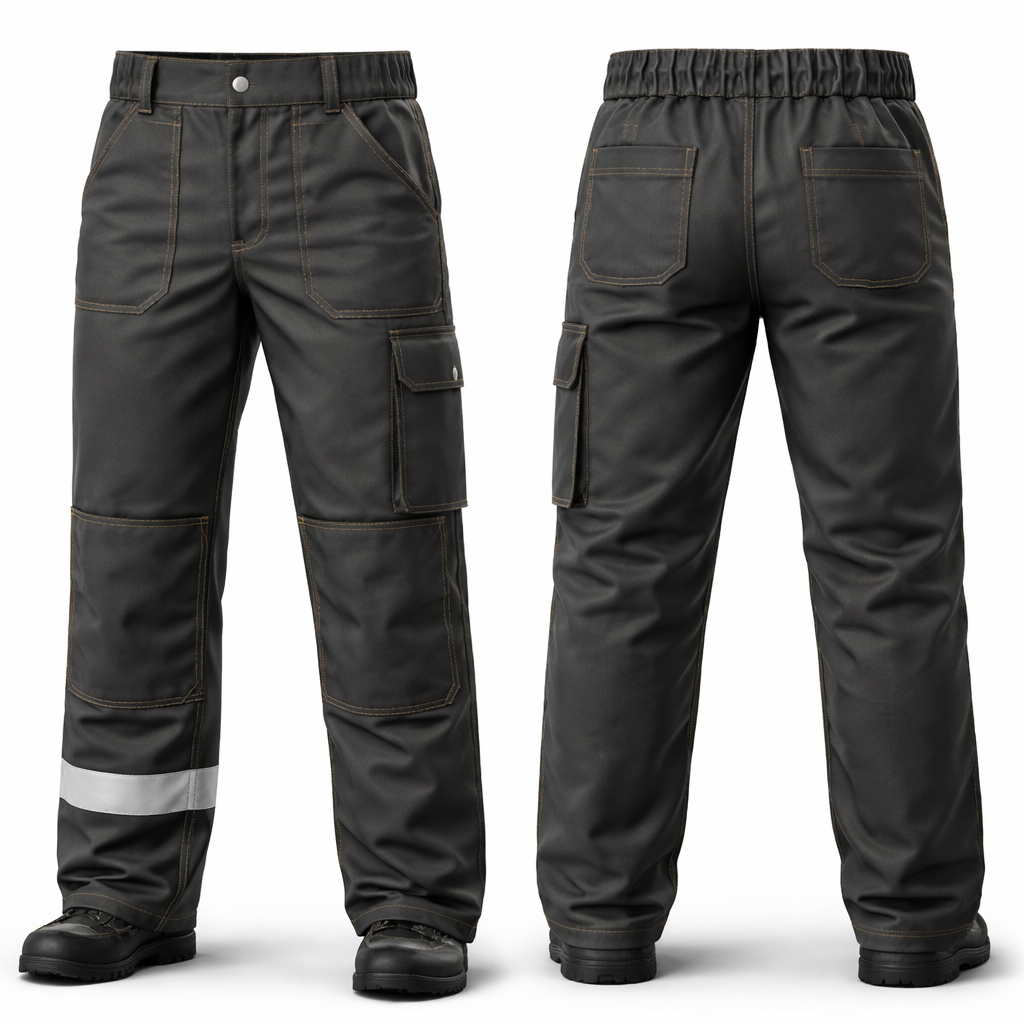 Прямые брюки из стиля рабочей одежды. Пояс широкий со шлёвками для ремня. По спинке от левого бокового шва до правого бокового шва проложена эластичная резинка. Резинка делает на поясе красивую сборку. Гульфик классический на пуговицах и пуговица на поясе. На передних половинках под поясом накладные карманы с отстрочкой. Вход в эти карманы с наклоном, по типу карманов ХУЛИГАН. В районе коленей накладные наколенники. На правой калошине, ниже наколенника, пришита по кругу штанины - светоотражающая полоска. На левой штанине светоотражающей полоски нет. На ягодицах накладные карманы по типу джинсовых, но без верхних клапанов. На ягодицах кокетки нет. На задних половинках над коленным сгибом нет поперечных швов. С левого бока по боковому шву - накладной карман для телефона. Для шитья использовать тёмно серую плащёвку с лёгким блеском.. Для отделочных строчек, нужно использовать контрастные нитки. Нужно показать вид спереди и сзади.