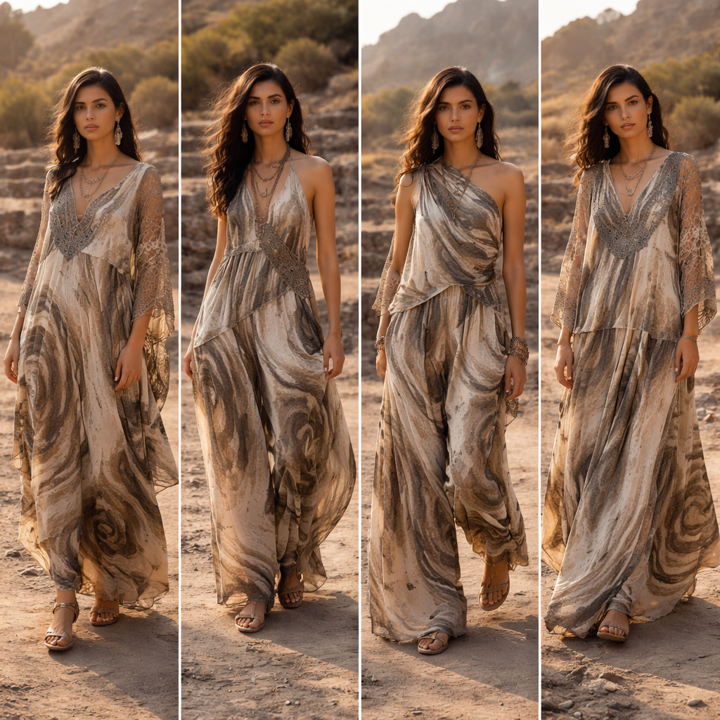 Fluid fashion design: Collection inspired by the ruins of Quilmes, Tucuman. Winding street patterns in grey and earth tones printed on flowing cotton and crocheted silk. Garments feature a loose, draped silhouette that moves freely with the body, creating an effortless, elongated line.