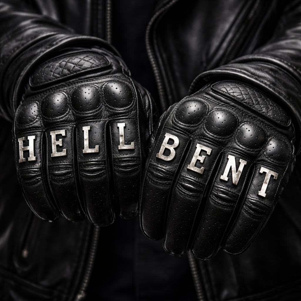 Western fashion design: Black leather motorcycle gloves, fitted, with "HELLBENT" spelled across the knuckles, one letter per finger. The 'T' is an upside-down cross.