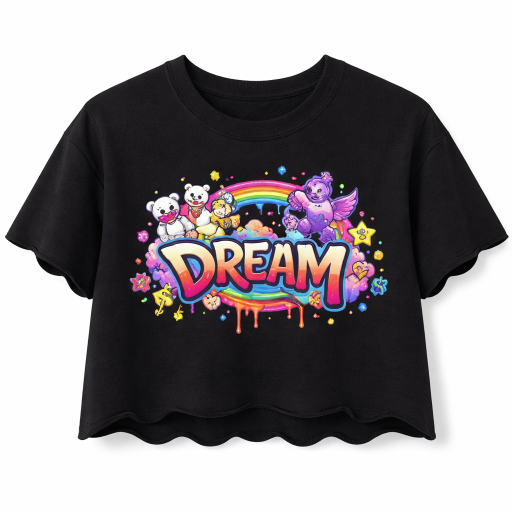 Streetwear fashion design: Black cotton crop top, relaxed fit. Scalloped hem. Embroidered graphic on front, bold colors.