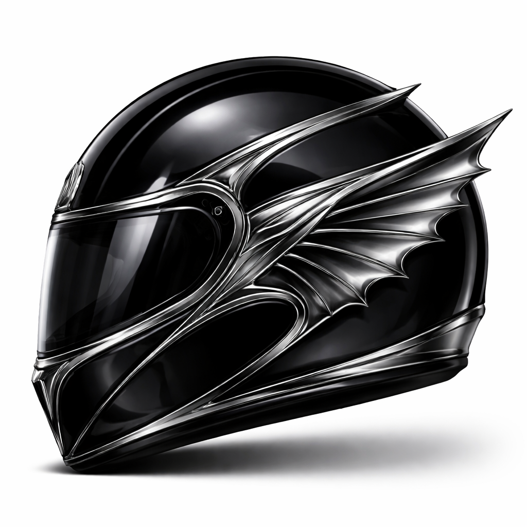 Luxury fashion design: Luxury motorcycle helmet, glossy black, Art Deco silver bat wings. Sleek, aerodynamic silhouette, high-shine finish.