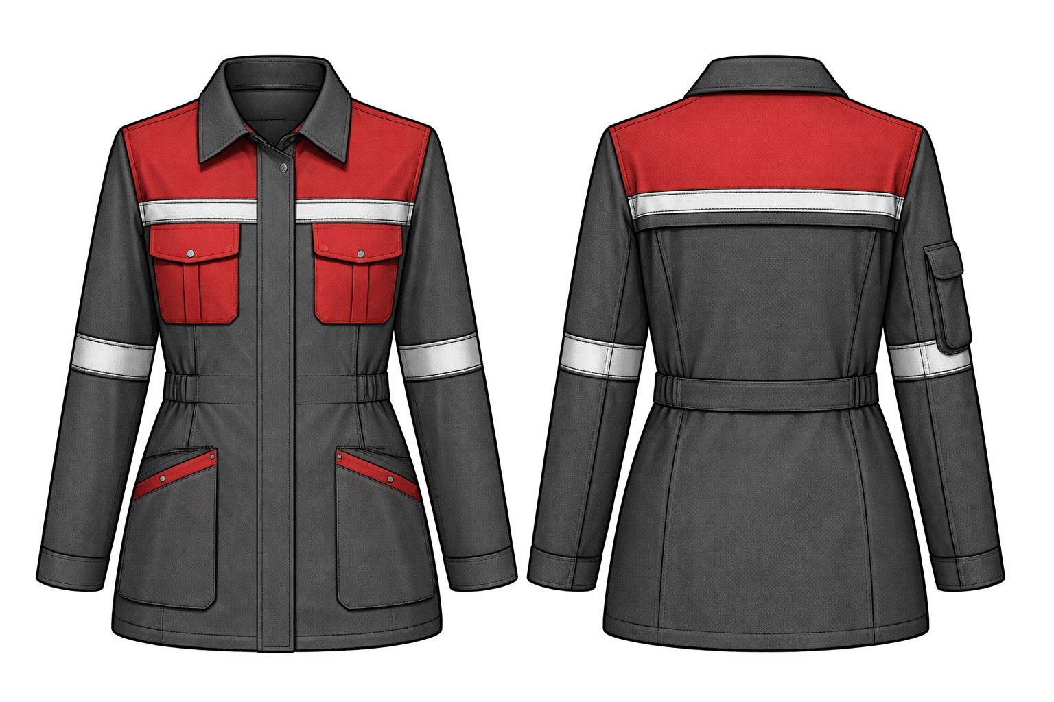 Сделай цветной технический рисунок: Женская куртка из серой плащёвки, рабочий вариант, прямого слегка приталенного силуэта, длиной до середины бедра. Материал – ветронепроницаемая плащевая с блеском ткань средней плотности, основного тёмно‑серого цвета. Куртка застёгивается по центру переда на потайную планку с пуговицами, планка визуально разделена вертикальными строчками. На спинке отлетная кокетка. На левом рукаве карман для мобильного телефона Покажи вид спереди и сзади. Светоотражающая полоска на левом рукаве не нужна Верхняя часть переда и спинки выполнена из контрастной красной плащёвки широкой кокеткой по всей ширине плеч. По низу кокетки спереди и сзади проходит горизонтальная широкая светло‑серая или белая вставка с двумя параллельными декоративными строчками, создающая эффект сигнальной полосы. На спинке под кокеткой – горизонтальная притачная деталь (пояс‑обтачка) в цвет основного серого. Воротник отложной, рубашечного типа, средней высоты, в цвет основного серого, с чёткой формой и аккуратной отстрочкой по краю. На груди спереди расположены два объёмных накладных кармана из красной ткани, прямоугольной формы, с клапанами на кнопках; верхняя линия карманов совпадает с нижним краем светлой горизонтальной вставки. В нижней части полочек, по бокам, находятся большие накладные карманы из серой плащёвки, с верхней скошенной частью и небольшими диагональными красными вставками по верхнему наружному углу. Рукава длинные, втачные, серого цвета по всей длине. В верхней трети рукава, чуть выше локтя, проходит горизонтальная светло‑серая/белая полоса с двумя параллельными строчками, аналогичная полосе на груди и спине. На нижней трети одного из рукавов (обычно левого) дополнительно расположен накладной продолговатый карман с клапаном. Низ рукавов оформлен простыми притачными манжетами без сложных застёжек, с отстрочкой по контуру. Низ куртки прямой, слегка закруглённый по бокам, с одинарной отстрочкой по краю, без разрезов. Все швы и линии контрастно отстрочены прямой чёрной или тёмно‑серой строчкой, подчёркивая конструктивные детали и придавая куртке аккуратный технический вид. Общий образ – современная женская рабочая куртка в индустриальном стиле, с серой основой, яркими красными зонами и светлыми сигнальными полосами., None style