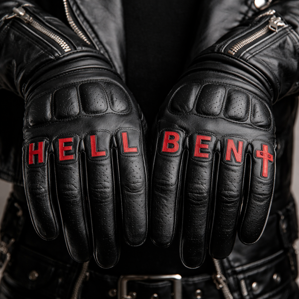 A pair of motorcycle gloves with "H E L L B E N T" on the fingers