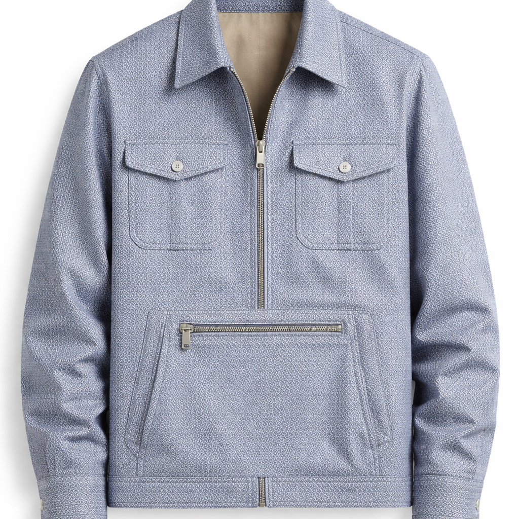 Ready To Wear fashion design: Structured cotton jacket, classic fit, long sleeves. Features a subtle, geometric pattern in blue and white. A practical front zip pocket is centered on the stomach.