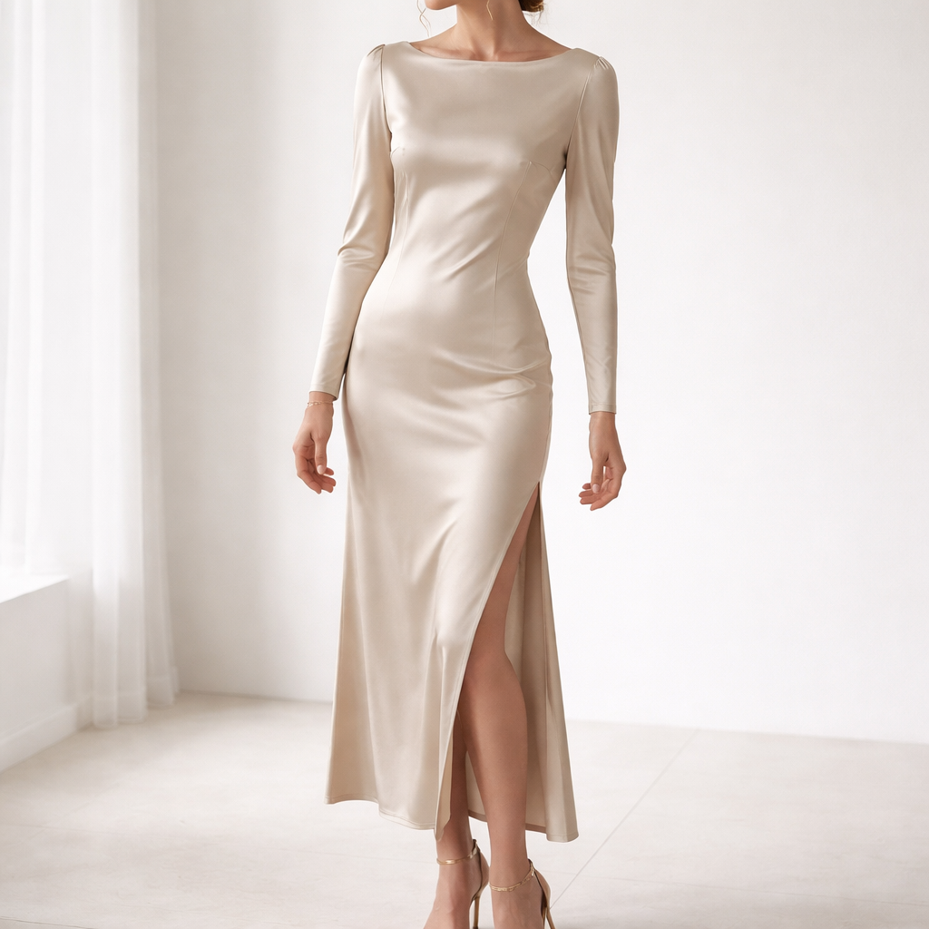 Mid-length silk slip dress with side slits, extended sleeves, and a boat neckline. Slim silhouette, smooth fabric.