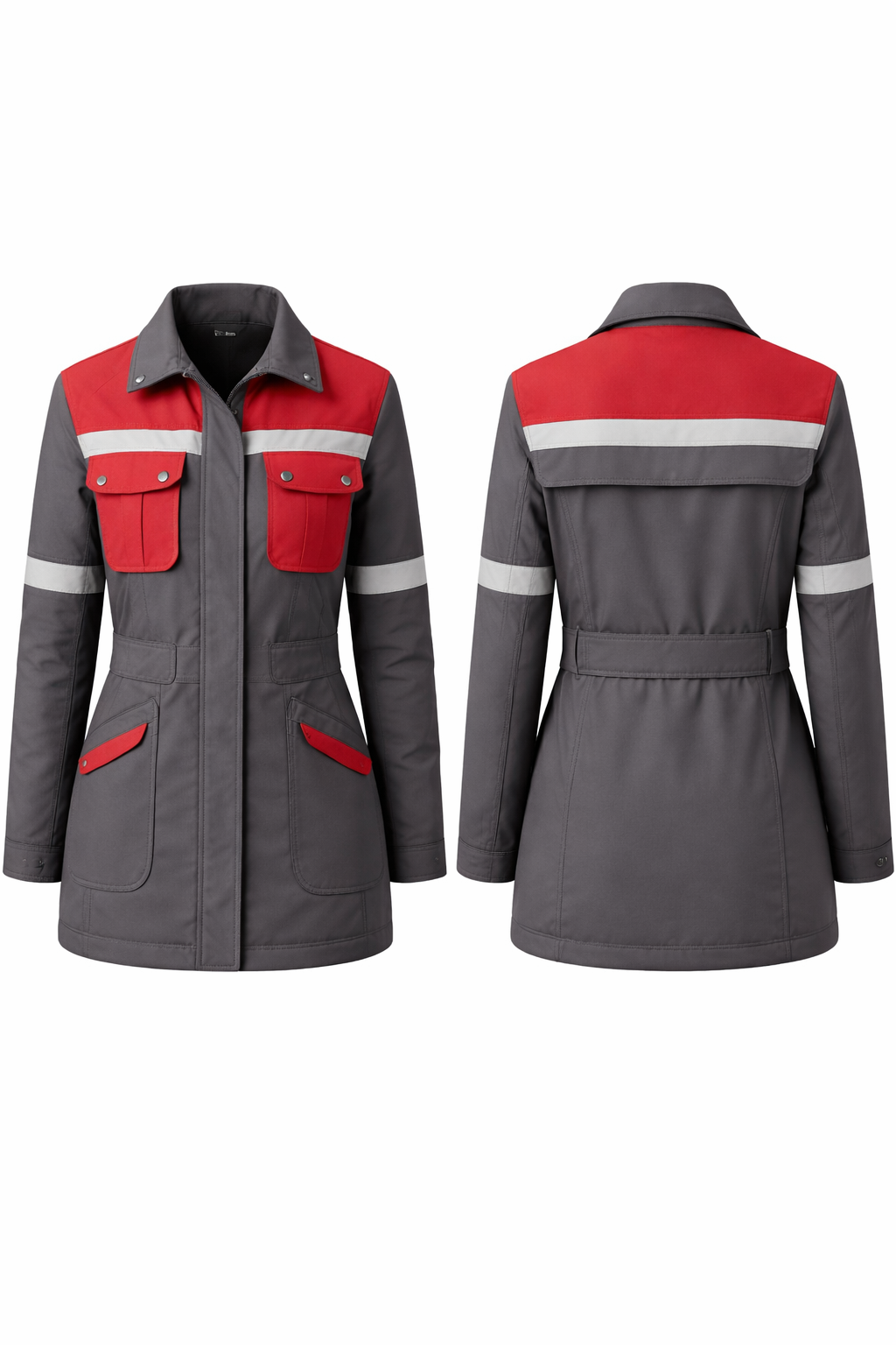 Женская куртка из серой плащёвки, рабочий вариант, прямого слегка приталенного силуэта, длиной до середины бедра. Материал – матовая водо‑ и ветронепроницаемая плащевая с блеском ткань средней плотности, с блеском, основного тёмно‑серого цвета. Куртка застёгивается по центру переда на потайную планку с пуговицами, планка визуально разделена вертикальными строчками. Покажи вид спереди и сзади. Верхняя часть переда и спинки выполнена из контрастной красной плащёвки широкой кокеткой по всей ширине плеч. По низу кокетки спереди и сзади проходит горизонтальная широкая светло‑серая или белая вставка с двумя параллельными декоративными строчками, создающая эффект сигнальной полосы. На спинке под кокеткой – горизонтальная притачная деталь (пояс‑обтачка) в цвет основного серого. Воротник отложной, рубашечного типа, средней высоты, в цвет основного серого, с чёткой формой и аккуратной отстрочкой по краю. На груди спереди расположены два объёмных накладных кармана из красной ткани, прямоугольной формы, с клапанами на кнопках; верхняя линия карманов совпадает с нижним краем светлой горизонтальной вставки. В нижней части полочек, по бокам, находятся большие накладные карманы из серой плащёвки, с верхней скошенной частью и небольшими диагональными красными вставками по верхнему наружному углу. Рукава длинные, втачные, серого цвета по всей длине. В верхней трети рукава, чуть выше локтя, проходит горизонтальная светло‑серая/белая полоса с двумя параллельными строчками, аналогичная полосе на груди и спине. На нижней трети одного из рукавов (обычно левого) дополнительно расположен накладной продолговатый карман с клапаном. Низ рукавов оформлен простыми притачными манжетами без сложных застёжек, с отстрочкой по контуру. Низ куртки прямой, слегка закруглённый по бокам, с одинарной отстрочкой по краю, без разрезов. Все швы и линии контрастно отстрочены прямой чёрной или тёмно‑серой строчкой, подчёркивая конструктивные детали и придавая куртке аккуратный технический вид. Общий образ – современная женская рабочая куртка в индустриальном стиле, с серой основой, яркими красными зонами и светлыми сигнальными полосами., None style