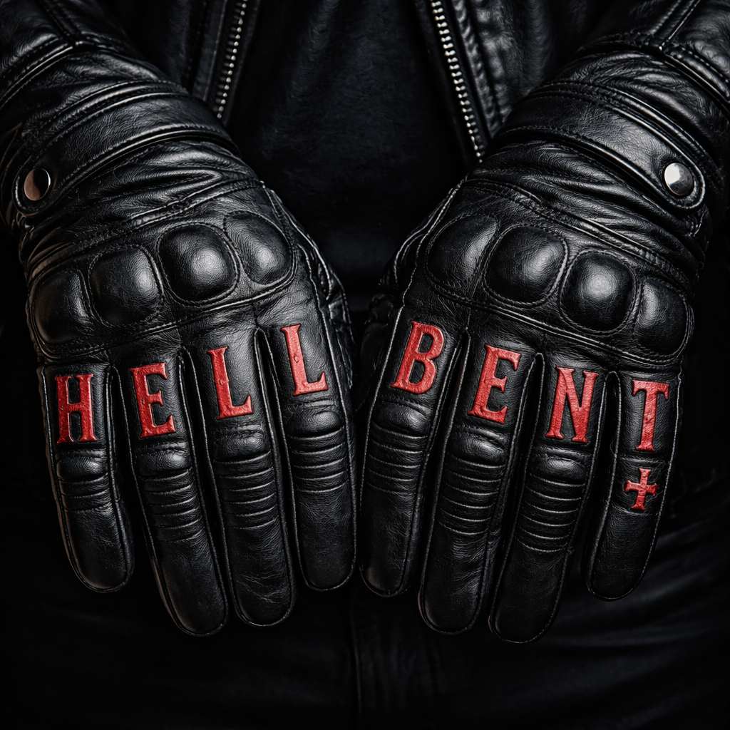 Motorcycle gloves with "HELLBENT"across the fingers one letter on each finger but the T is an upside down cross