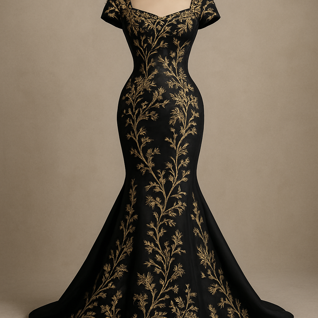 Haute Couture fashion design: Black silk fish-cut gown, adorned with delicate gold embroidery forming nature-inspired patterns. The embroidery highlights the sculpted silhouette, offering a striking, opulent contrast.