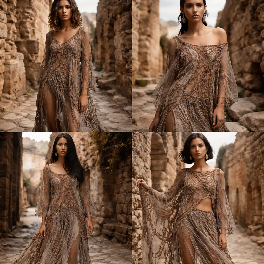 Sheer fashion design: Argentine ruins inspire this sheer collection. Winding street patterns in crochet on cotton and silk. Earthy browns and grays. Loose, flowing fit.