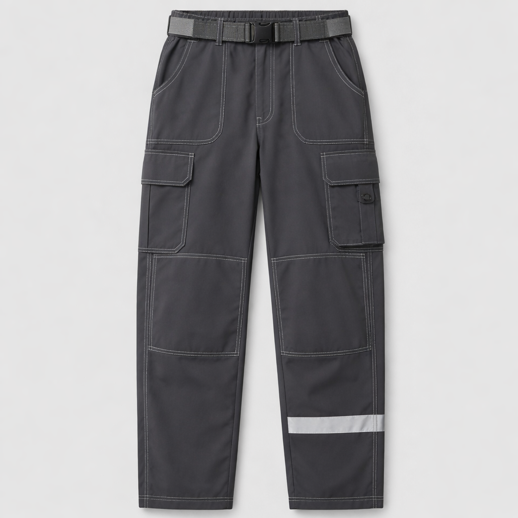 Классические прямые брюки с наколенниками. Спереди симметричные накладные карманы со скосом как карманы хулиган, на правой штанине над коленом по боковому шву объёмный накладной карман с клапаном над ним. На левой штанине ниже наколенника пришита круговая светоотражающая полоса. Форма задних карманов, как в джинсах. нитки использовать контрастные. Пояс под широкий ремень. Пояс от левого бокового шва до правого бокового шва по спинке с эластичной резинкой. Брюки полностью сделаны из тёмно серой плащёвки