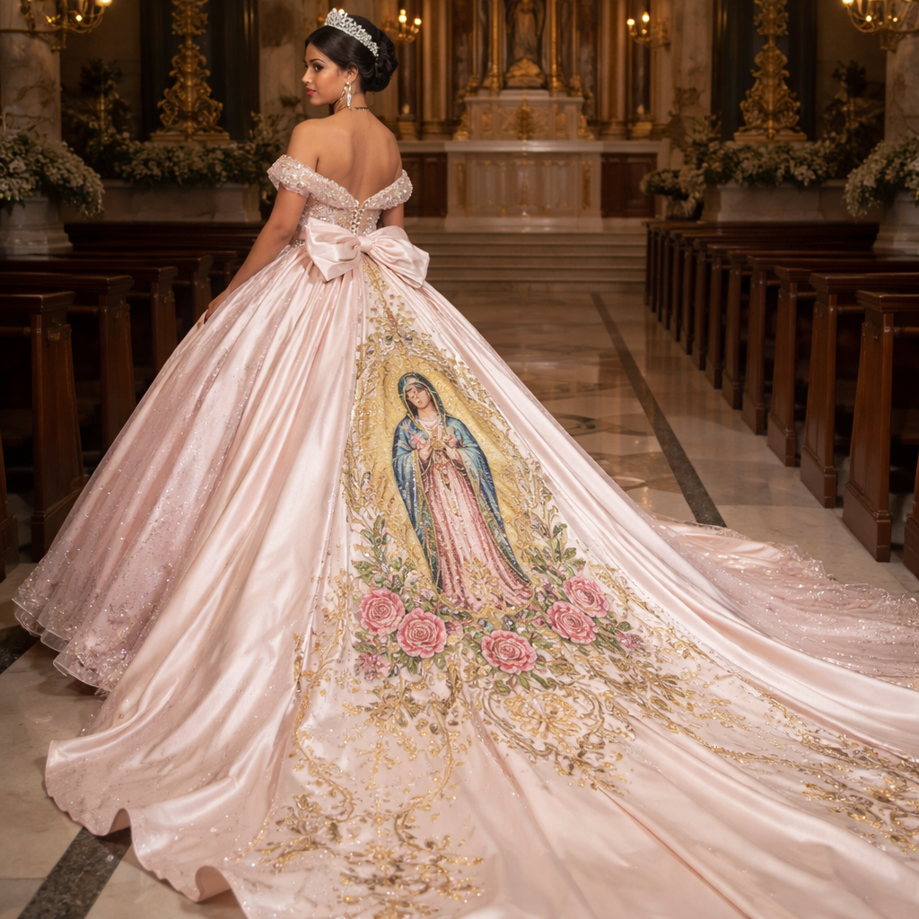 Luxury fashion design: A light pink, off-the-shoulder quinceanera gown of silk, resplendent with crystal accents on the bodice and a sweeping train. A large bow adorns the back. The detachable silk cape, featuring an embroidered Virgin de Guadalupe, creates an elegant church ensemble.