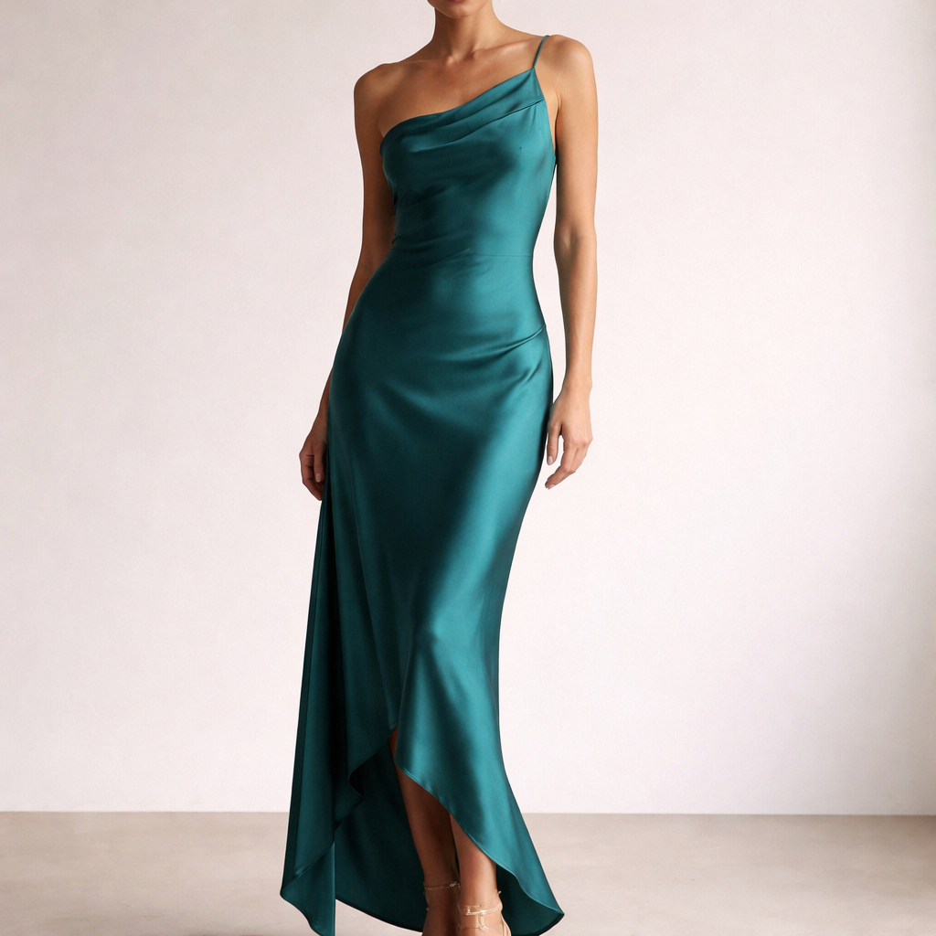 Contemporary fashion design: Teal silk maxi dress. Clean lines, draped silhouette. Asymmetrical hem, minimalist cut. Slim fit.