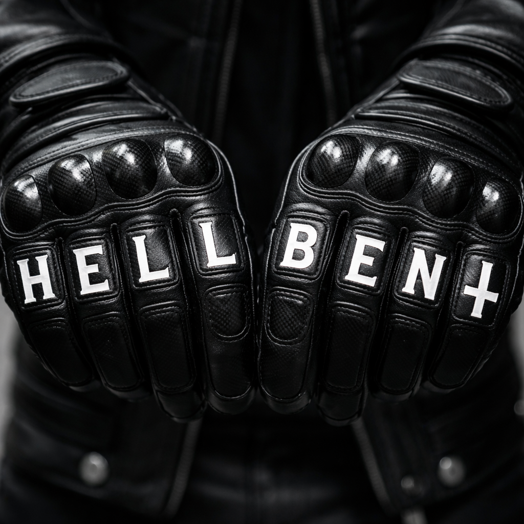 A pair of motorcycle gloves with "H E L L B E N T" on the fingers