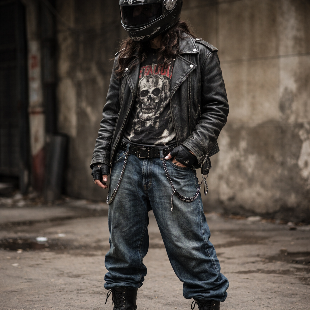 Grunge fashion design: **Worn leather jacket, ripped band t-shirt, baggy jeans, combat boots. Vintage motorcycle helmet: dull black, art deco bat wing graphic in silver on sides.**