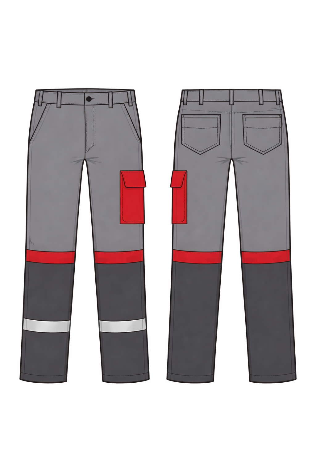Ниже колена по обеим штанинам — горизонтальная красная полоса-лампас по кругу штанины на сером фоне, на уровне середины голени. Ещё ниже, ближе к низу: На правой штанине чёрная нижняя часть (от колена до низа) с серой горизонтальной светоотражающей полосой ближе к низу. Общие параметры брюк: Брюки прямые, классический рабочий силуэт, без заужения по низу. Посадка средняя, пояс на уровне естественной талии, застёжка гульфика на пуговицах с притачной планкой и одной верхней пуговицей на поясе. Пояс с пятью-шестью шлёвками под ремень (по центру спинки, по бокам и рядом с гульфиком). Передняя половинка : Два классических боковых входа в карман по линии бокового шва, с мешковиной, вход немного наклонный вперёд. Задняя половинка Два накладных задних кармана классической формы, со скошенными верхними уголками, расположены симметрично. На левой штанине сбоку, чуть ниже уровня колена — накладной объёмный карман с клапаном, весь красного цвета; вход под клапан горизонтальный. Цвета Основной цвет брюк: средне‑серый. Цвет контрастных крупных вставок и карманов: ярко‑красный. Цвет светоотражающих полос: светло‑серый/серебристый (как на куртке и штанинах). Как оформить технический рисунок Формат: фронт и спинка брюк в стиле «technical flat», без теней, только контур и заливка цветов по блокам. Все конструктивные линии (швы, вытачки, подгиб низа, стёжка по карманам, гульфик, шлёвки) прорисовать тонкой линией поверх цветных заливок.