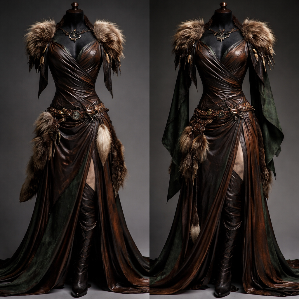A dress for Diana, goddess of the moon, goddess of the hunt, stag killer, bow slinger, drapped put together from found textures, leather, blacks, browns, greens, animal furs