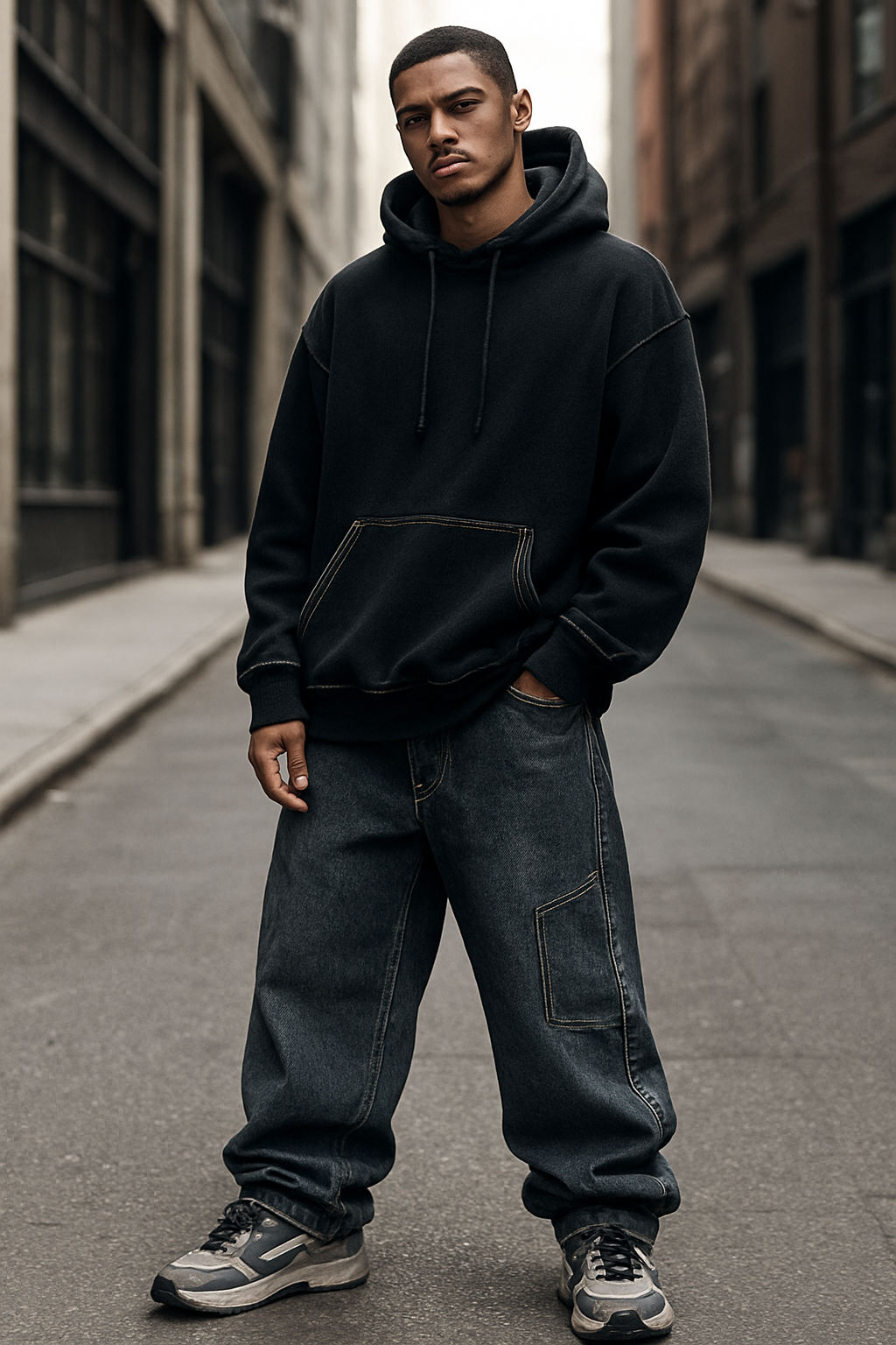 Streetwear fashion design: Powerful streetwear. Oversized heavy cotton hoodie, baggy denim pants, urban sneakers. Black, white, gray, subtle color accents. Raw street attitude, confident pose. Visible stitching. City background, natural light. High detail, photorealistic, street photography, sharp focus, 4K.